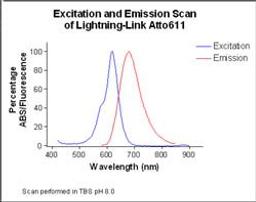 Atto611 is part of the new generation of fluorescent labels for the red spectral region. It has a strong absorption with its maximum at 611nm (and Extinction Coefficient of 1 x 105 M-1 cm-1), high fluorescence quantum yield with the maximum emission at 681nm, and an exceptionally large Stokes-Shift of 70nm. Atto611 can be used as a substitute dye for Carboxynapthofluorescein, DY-610, LightCycler Red 640, BODIPY 630/650.