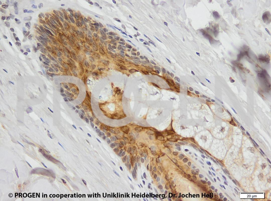 <p>Ks6.KA12 represents an excellent marker for non-keratinized squamous epithelia and proliferating cells of epidermis (e.g. within psoriatic lesions).</p> <p>Polypeptide reacting: Mr 56,000 polypeptide (keratin K6; formerly also designated cytokeratin 6) of human squamous epithelia.</p> <p>Tissues and tumors specifically detected: the antibody is suitable for discrimination of keratinizing and non-keratinizing squamous cell carcinoma versus e.g. poorly differentiated adenocarcinoma.</p>