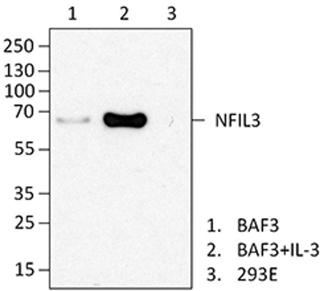 Purified anti-NFIL3; Clone: 12H8C35; Reactivity: Mouse; Apps: WB, IF; Size: 100 μg