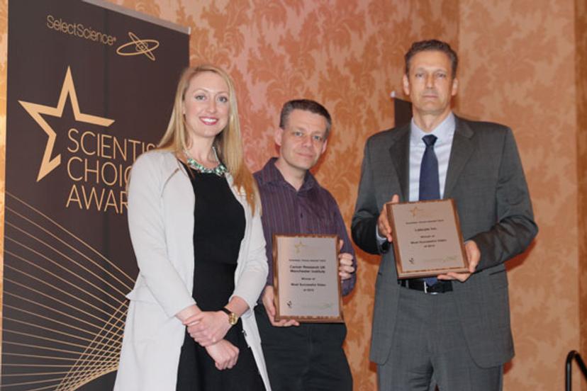 Dr Allan Jordan, Head of Chemistry, Drug Discovery Unit, Cancer Research UK Manchester Institute, and Chris Grimley, Vice President, Marketing, Labcyte, accepted the award for Most Successful Video of the Year
