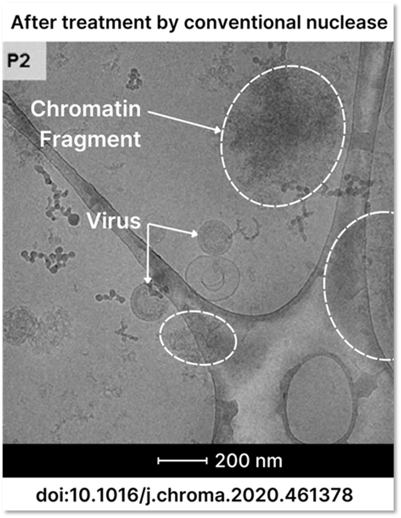 These publications demonstrate that traditional nucleases not only digest DNA from crude harvests less efficiently than M-SAN HQ, but that the residual DNA is in the form of large chromatin structures causing problems in DSP. These publications show that M-SAN HQ efficiently fragments chromatin to sizes allowing easy removal in the DSP without additional salt. This not only improves the purity of the viral vector but also the potential to enhance DSP efficiency, increase yield, shorten processing times, and reduce costs in manufacturing therapeutic viruses.