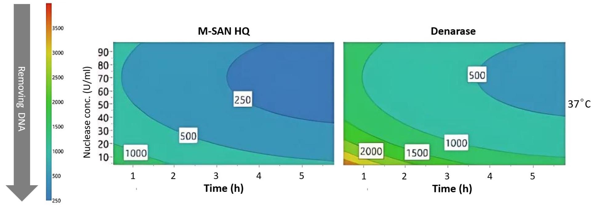 Recent publications have demonstrated that M-SAN HQ is superior for fragmenting chromatin in viral vector manufacturing at typical cell media conditions. Pagallies et al. compared the performance of M-SAN HQ and Denarase (recommended by c-LEcta for use at NaCl levels below 200 mM) during the scale-up of manufacturing fragile, large, and enveloped Orf viruses in suspension cell culture1. Pagallies’et al. showed that, compared to Denarase, M-SAN HQ removed significantly more DNA from crude harvest. Using M-SAN HQ significantly enhances the efficiency of DNA digestion at 37°C, reducing both the digestion time and the amount of nuclease required, while also improving overall DNA removal (Figure 2).