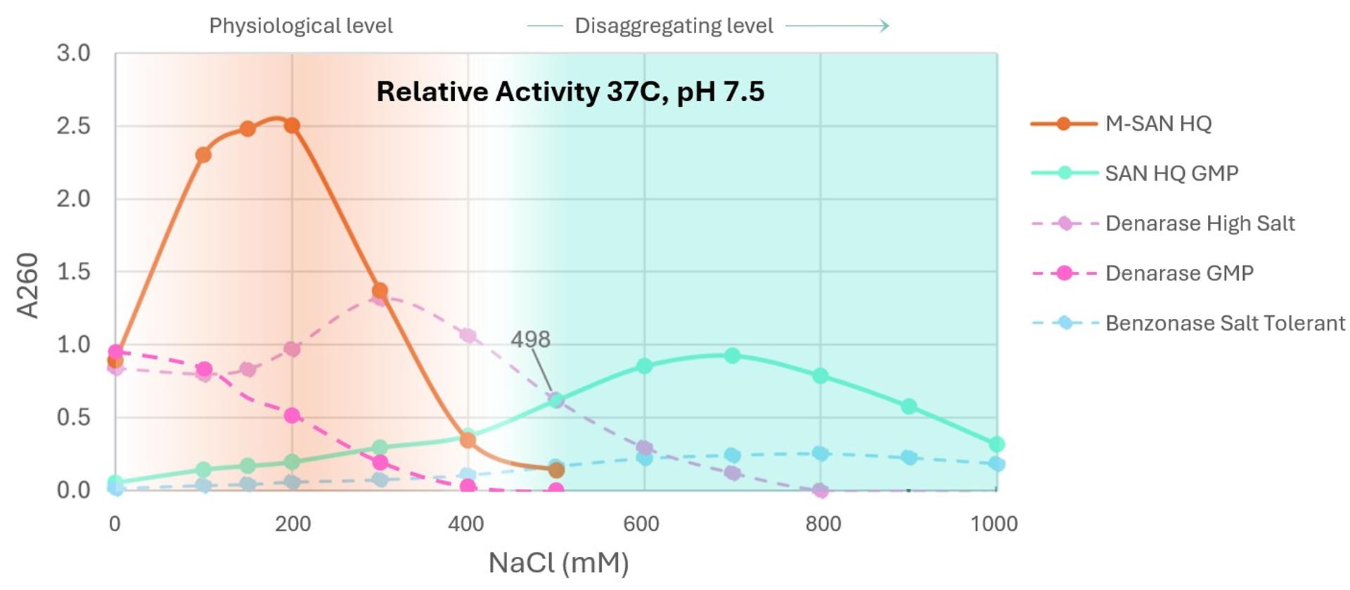 Figure 1: At physiological salt (corresponding to 135 – 150 mM NaCl), M-SAN HQ shows higher activity than other commercially available nucleases. The reactions were incubated 20 min at 37°C with 0.2 mg/ml Calf Thymus DNA, 5 mM MgCl2, 25 mM Tris-HCl (pH 7.5) @ 37°C and various salt concentrations. The reactions were stopped by adding perchloric acid, incubated on ice for 20 min, centrifuged and measured at Abs260.