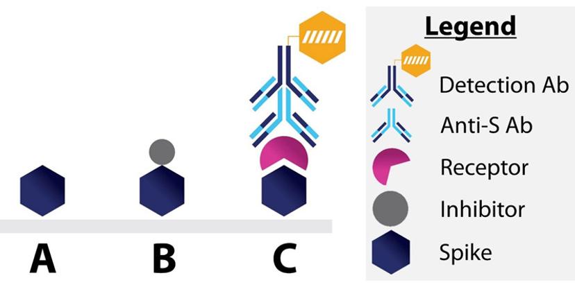 ELISA is an in vitro, and plate-based method used to detect the Spike-receptor complex (Figure 1). Briefly, the sample and receptor competitively bind to the S protein, which is coated on the plate. The amount of S-receptor complex can then be measured using an anti-receptor antibody and a detection antibody. Get results within 5 hours with these simple-to-use kits!