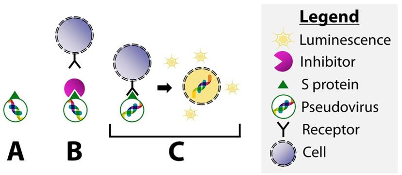 A SARS-CoV-2 pseudovirus is a viral particle that can mimic viral entry, but is not considered a live virus. As such, SARS-CoV-2 pseudoviruses are employed to screen for S inhibitors. In the example demonstrated in Figure 2, a SARS-CoV-2 pseudovirus expresses the S protein on the surface while containing a gene encoding for luciferase. Once the pseudovirus enters the host cell, the luciferase is expressed. In the presence of a luciferase substrate, cells that have been successfully infected with the pseudovirus will luminescence. In the presence of S inhibitors, the level of luminescence will decrease. Obtain data within 2 weeks with RayBiotech’s full testing service.