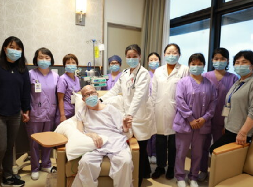 Dr. Xuan Linli, Chief of Medical Oncology at Jiahui International Cancer Center, stands on the patient’s right. The patient’s daughter, nursing team, medical team, and caregivers are gathered together at Jiahui International Hospital.