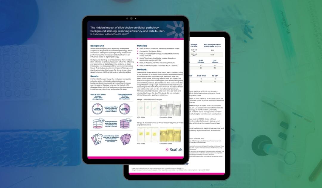 Hidden background staining is sabotaging your digital pathology ROI. New research reveals that poor slide choice can inflate file sizes by 4x and slow scanning speeds by 6x. These inefficiencies drain histotech time and drastically increase annual storage costs. Download this latest study to see how switching to digital-ready adhesion slides can streamline your workflow and slash your long-term archiving expenses.
