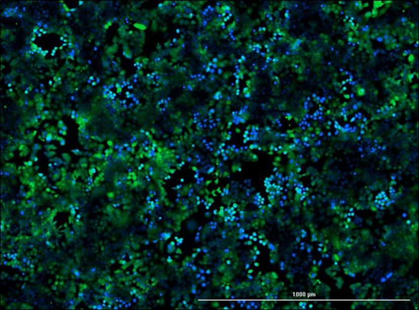 Mitoxantrone resistant breast cancer cell line MCF-7 M100 stained with calcein (Green) and Hoechst 33342 (Blue).