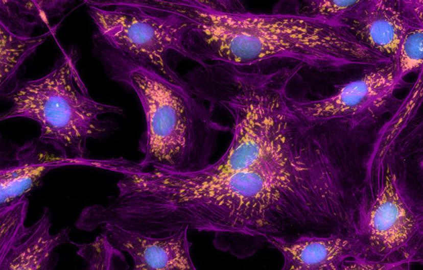 40X Digital Confocal* images of BPAE cells with nuclei (blue), mitochondria (pseudocolored yellow), and actin (pseudocolored purple) staining. Images were captured on the ImageXpress Pico image courtesy of Molecular Devices
