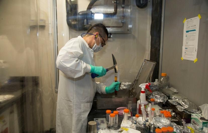Dr Sylvan at work aboard the JOIDES Resolution in January 2016, sampling rocks from below the seafloor to determine their enzyme activity rates Image credit: Virginia P. Edgcomb, WHOI