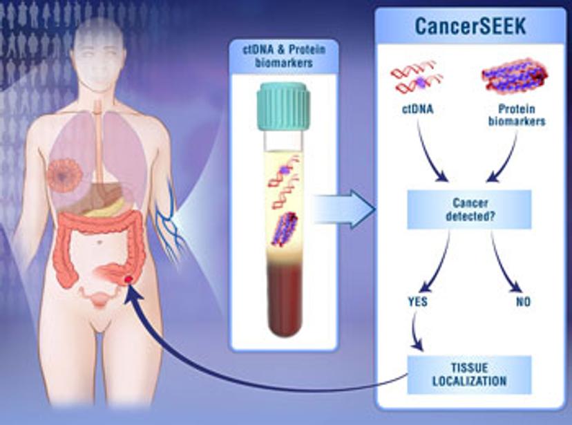 The test, called CancerSEEK, is a unique noninvasive, multianalyte test that simultaneously evaluates levels of eight cancer proteins and the presence of cancer gene mutations from circulating DNA in the blood. The test is aimed at screening for eight common cancer types that account for more than 60 percent of cancer deaths in the U.S. Five of the cancers covered by the test currently have no screening test.
