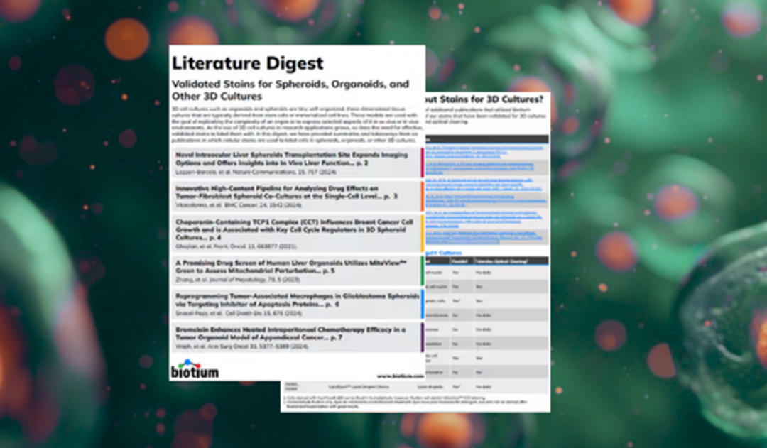 As adoption of 3D culture systems accelerates across a wide range of research fields, so does the demand for high-performance, validated cellular stains that can deliver clear, reliable results. This resource helpfully spotlights six key publications that showcase how Biotium’s unique cellular stains are successfully applied in labeling cells within spheroids, organoids, and other 3D culture systems, providing you with actionable insights and proven approaches to enhance your own 3D culture studies.