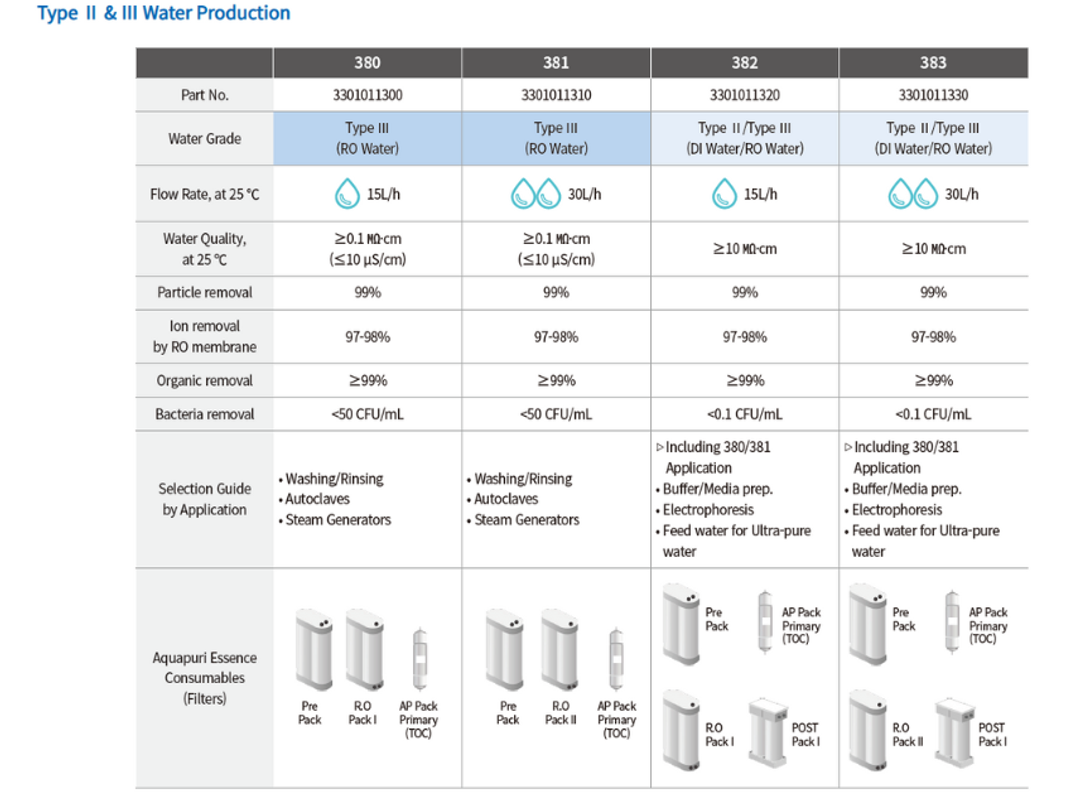 aquapuri Essence produces pure water of Type Ⅱ & Ⅲ grade with the innovative filtration technology