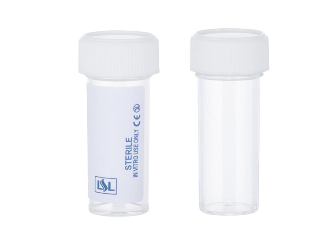 Ultra clear, sterile polystyrene bijou containers with white polypropylene screw caps.