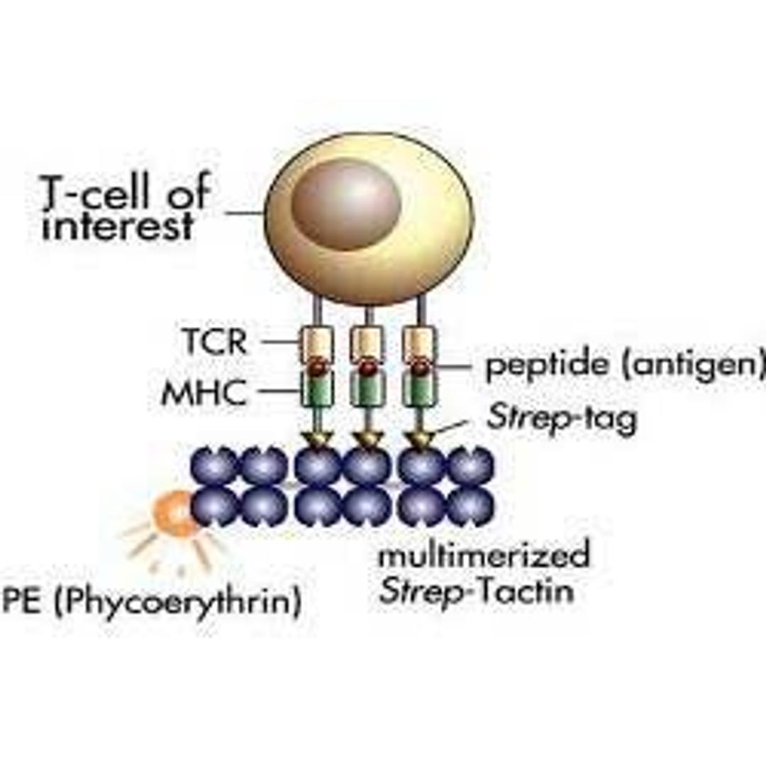 Fluorescent Streptamer®: R-Phycoerythrin (PE) (or Allophycocyanin, APC) conjugated to Strep-Tactin® for using the Streptamer® technology. Fluorescently labelled Strep-Tactin® multimerizes recombinant Strep-tagged MHC-I molecules via the reversible interaction between the Strep-tag® affinity tag and Strep-Tactin®. The resulting multimer stains T-cells which are specific for the respective peptide-loaded MHC molecule. After fluorescence assisted sorting of the cells, Strep-Tactin® can be mildly and rapidly dissociated from the T-cells by using biotin. The monomeric MHC I-Strep then spontaneously dissociates from the T-cell receptor due to its very weak binding. The rapid and complete dissociation of Streptamers from the T-cells assures full functionality of the isolated cells.