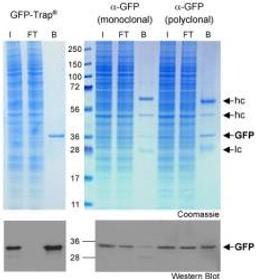 This is an excellent product. Both the agarose and magnetic bead formats are extremely efficient for immunoprecipitation of GFP tagged proteins, and the usual heavy and light antibody chain contamination is avoided.