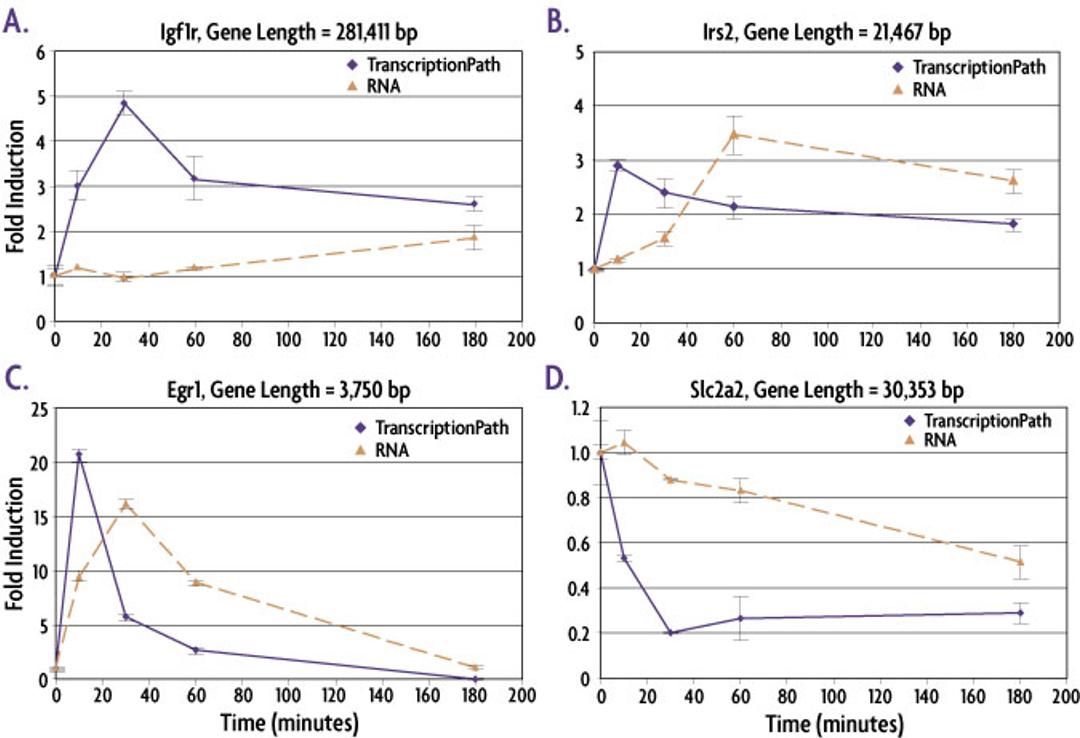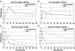 The TranscriptionPath method utilizes Chromatin Immunoprecipitation (ChIP) to measure transcription rates as a function of RNA Polymerase II (RNAPII) occupancy across the genome. The assay can be combined with Next-Generation sequencing (TranscriptionPath-Seq) for a genome-wide readout, or it can be used with qPCR for a gene-specific readout. TranscriptionPath offers several advantages when compared to RNA-based approaches including the ability to look at early time points that are not accurately measured with mRNA approaches and the ability to measure gene expression in the same sample as was used to measure transcription factor (TF) binding by ChIP.