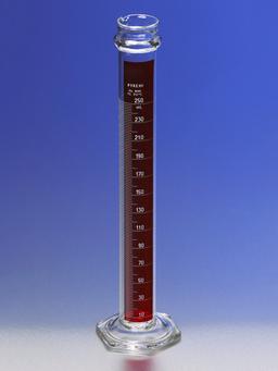 These 250 mL PYREX® graduated cylinders are calibrated (TC). The scale and figures are durable white enamel, which stand out clearly against the red color-band on these Lifetime Red™ cylinders. This provides clear, accurate measurements for delivering or containing liquids. A reinforced bead of glass near the top helps to reduce breakage, if the cylinder upsets.