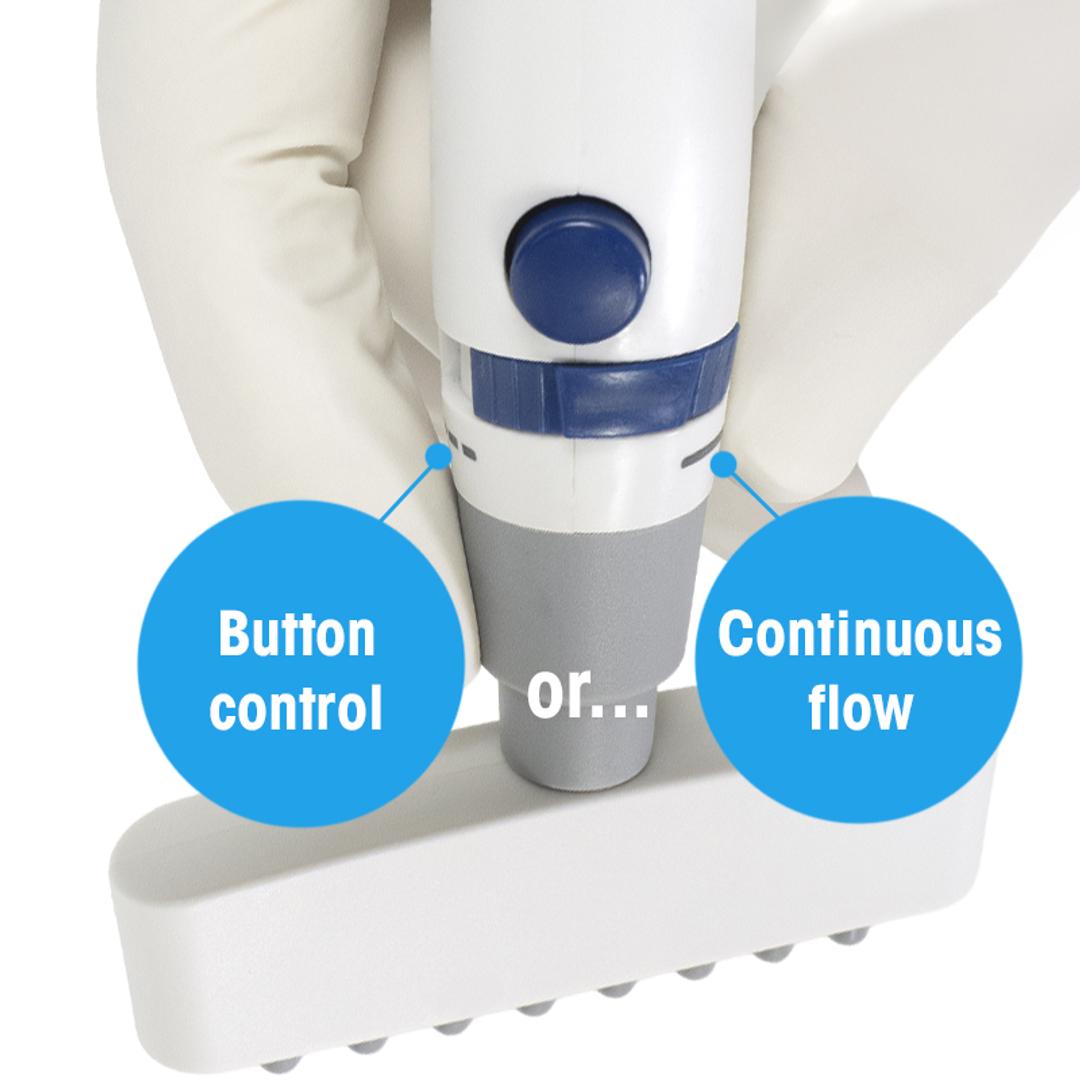 - Continuous flow - QuickFlow’s continuous mode isn’t just more efficient–it’s a hand saver. Repeatedly pressing the aspiration button creates undue strain that, over time, can contribute to repetitive strain injury. QuickFlow™ eliminates this problem by allowing users to select continuous flow and the amount of suction.