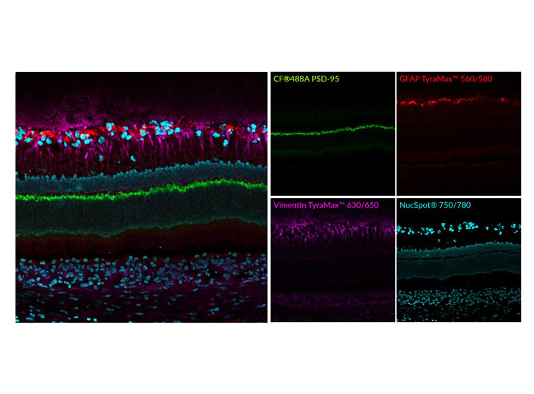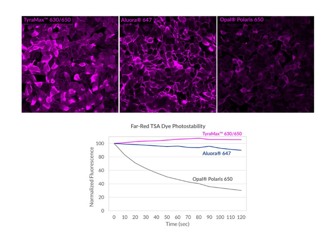 TyraMax™ Dyes are next-generation tyramide (TSA) dyes for spatial biology with colors from blue to near-IR, named for their excitation/emission. They are stable in amplification buffer with advantages in color selection, brightness, and photostability versus other TSA dyes.