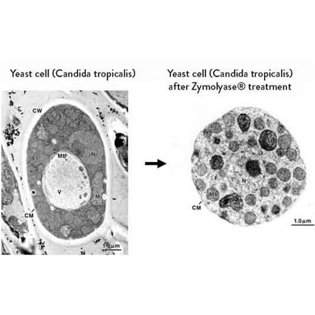 Zymolyase® , produced by a submerged culture of Arthrobacter luteus, has strong lytic activity against living yeast cell walls, to produce protoplast or spheroplast of various strains of yeast cells. An essential enzyme for the lytic activity of Zymolyase® is Beta-1,3-glucan laminaripentaohydrolase. It hydrolyzes linear glucose polymers at Beta-1,3-linkages and releases specifically laminaripentaose as the main and minimum product unit. There are two preparations of Zymolyase® , Zymolyase®-20T and Zymolyase®-100T, having lytic activity of 20,000 units/g and 100,000 units/g respectively. Zymolyase®-20T is ammonium sulfate precipitate while Zymolyase®-100T is a further purified preparation by affinity chromatography. Lytic activity varies depending on yeast strain, growth stage of yeast, or cultural conditions.