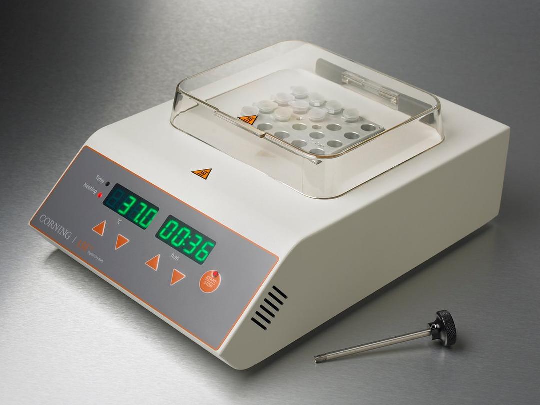 The Corning Digital Dry Bath Heaters are available in single, dual, and four block configurations and provide a broad temperature range up to 150°C, which makes them useful for a variety of applications in molecular biology, histology, clinical, environmental, and industrial laboratories. They have been designed to incorporate the best combination of features including block capacity, dual displays, and an external temperature probe that gives life science researchers the confidence and efficiency they need when working with precious samples.
