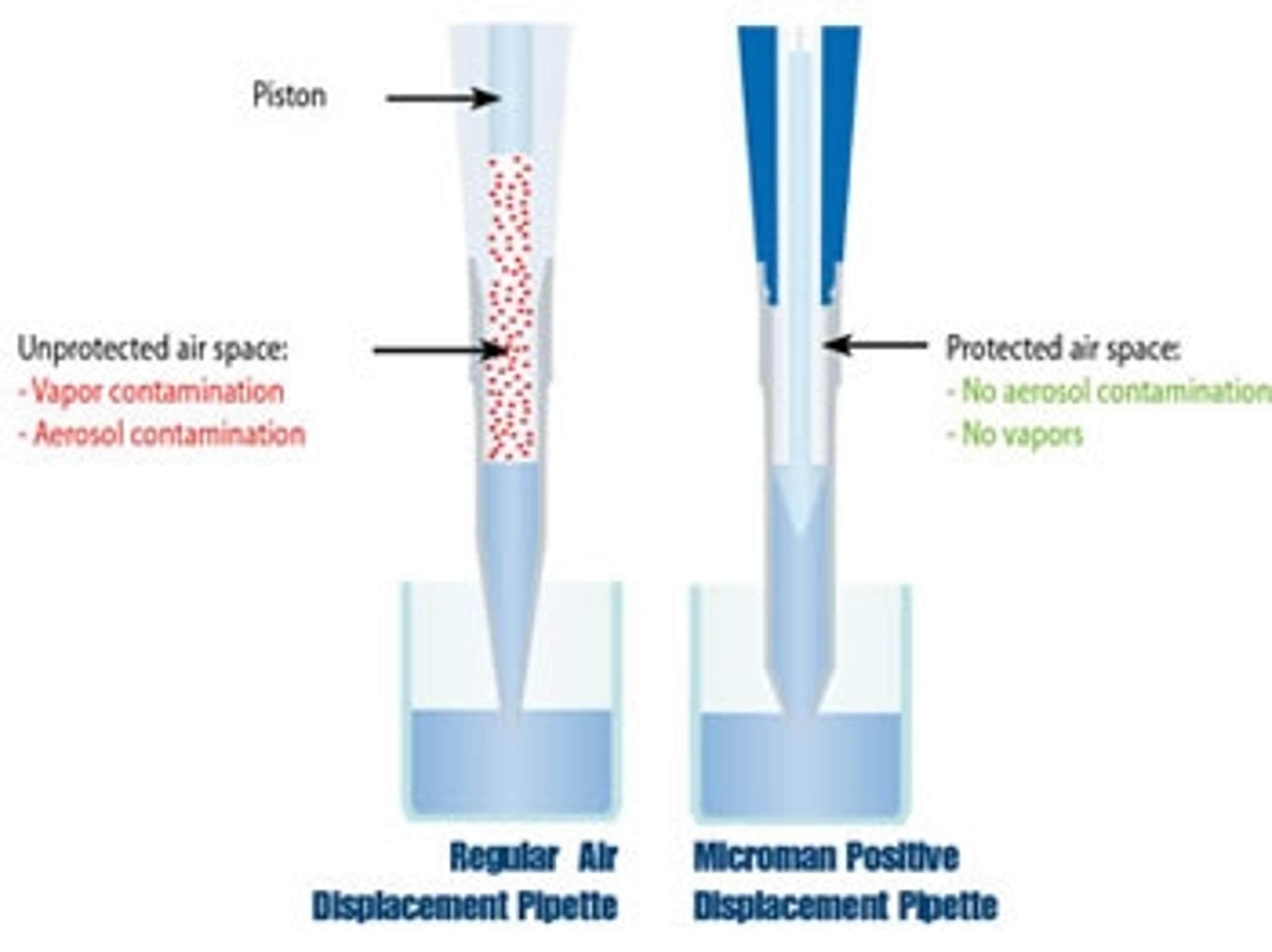 The positive-displacement technology of the MICROMAN E is ideal when dealing with infectious solutions and radiolabeled components. Since the disposable piston makes direct contact with the sample, the user and the pipette are protected. Within molecular biology and forensic sciences, any trace of a previous sample can lead to erroneous results and the disposable CP tips provide absolute protection against cross-contamination.