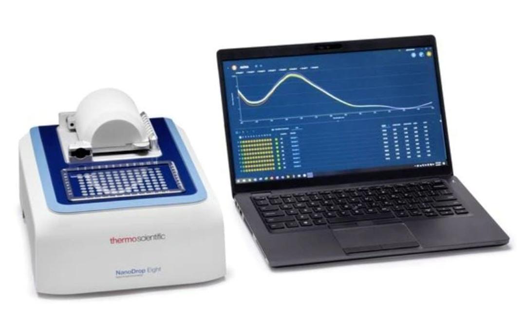NanoDrop Eight is a multichannel spectrophotometer that allows the easy quantification of samples with confidence. It's a state-of-the-art microvolume UV-Vis spectrophotometer with enhanced hardware and the finest software features from the Thermo Scientific™ NanoDrop™ One/OneC Spectrophotometer