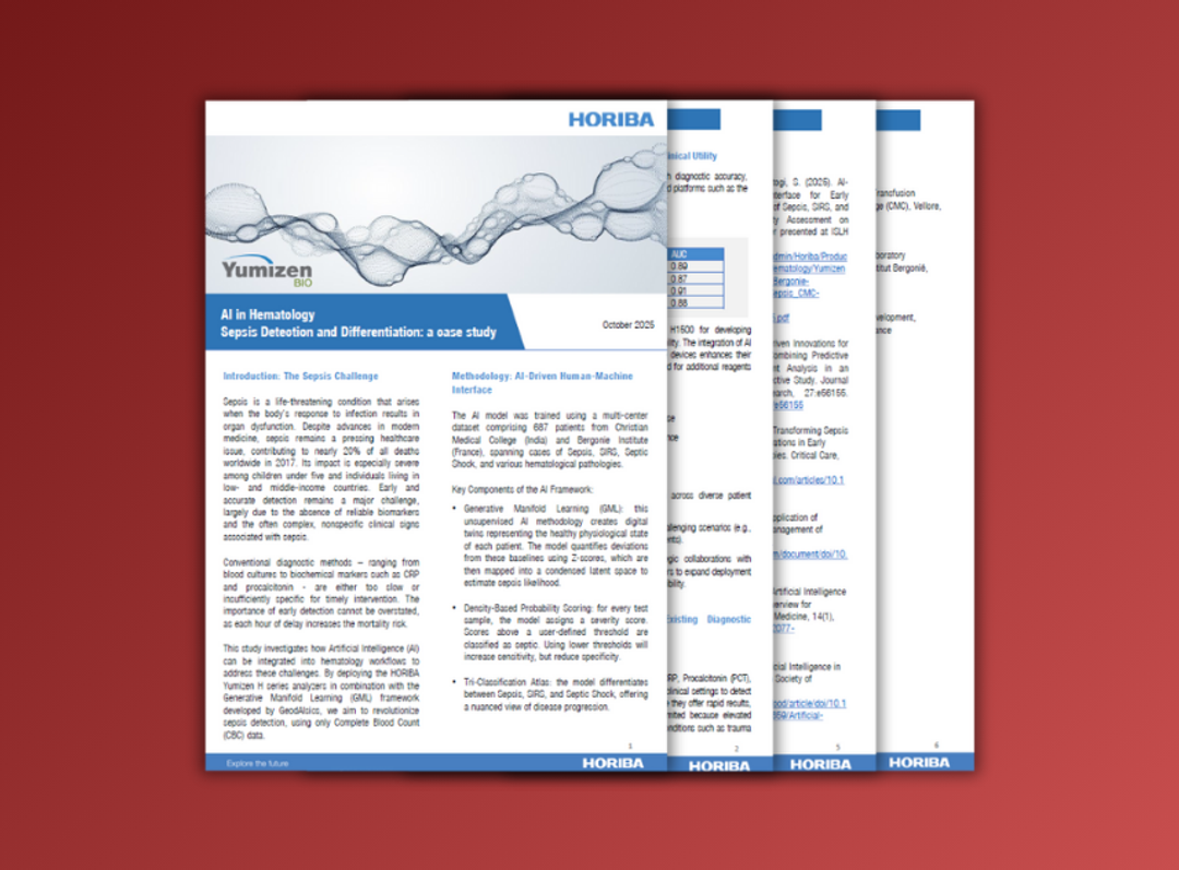 Learn how artificial intelligence (AI) can be integrated into hematology workflows to overcome key challenges in sepsis diagnosis. By leveraging the HORIBA Yumizen H series analyzers together with the Generative Manifold Learning framework developed by GeodAIsics, Horiba aims to transform sepsis screening using only CBC data, enabling faster, more accurate, diagnostic support.